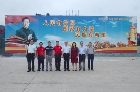 ▲ 调研组一行与基地董事长周继权和总经理肖文治基地训练大坪的习主席背景喷绘前合影留念。