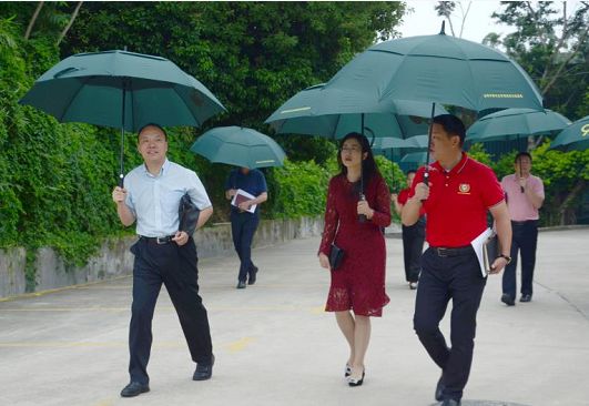 ▲ 天空飘起小雨,调研组一行打着雨伞在基地周继权董事长陪同下检查基地环境。